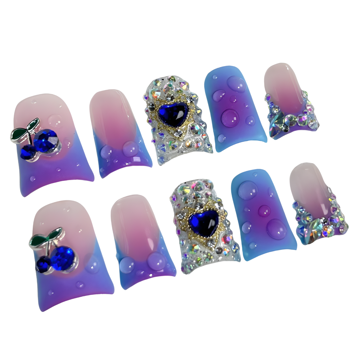Playful yet regal – gradient shimmer with gem cherries and heart jewels, perfect for birthdays or festival nights