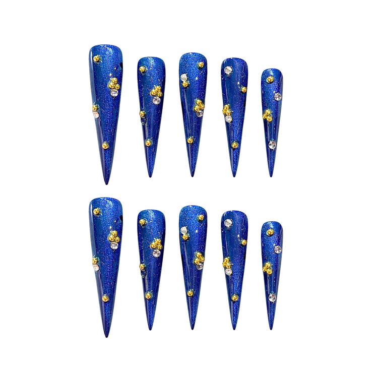 A majestic deep-blue design illuminated with shimmering gold accents and crystal details, capturing the elegance of a royal night sky - luxurious, radiant, and made to shine after dark.