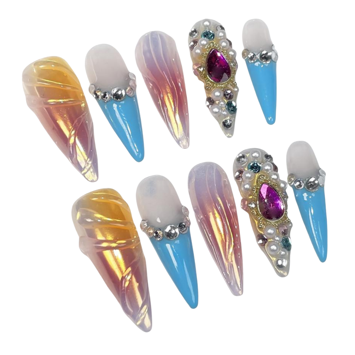A dazzling mix of iridescent peachy-pink chrome, matte sky blue tips, and royal gem accents - this set captures the glow of a sunrise with the glam of a queen