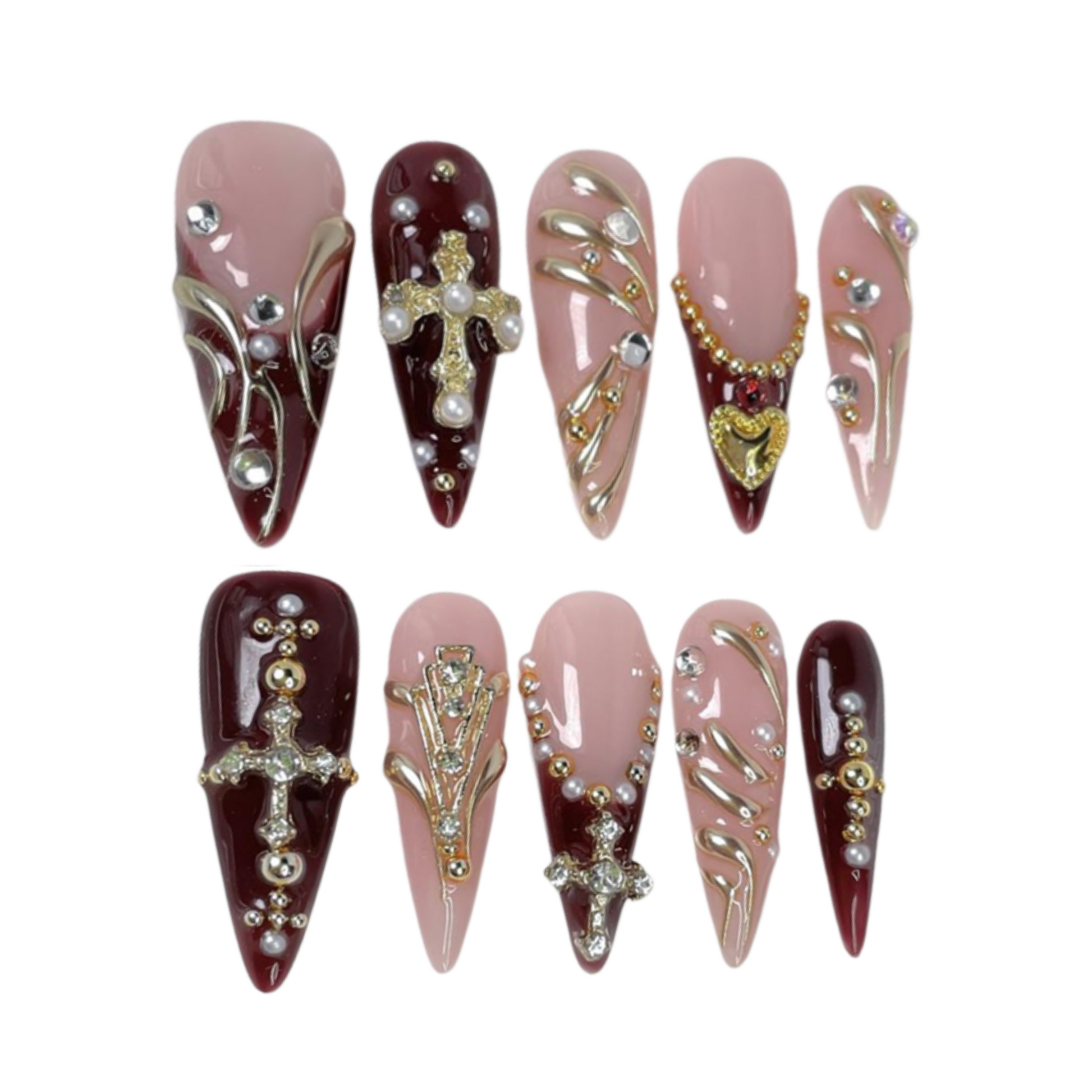 A dramatic blend of deep crimson and soft blush, accented with golden crosses, pearls, and jeweled details for a divine, elegant look.