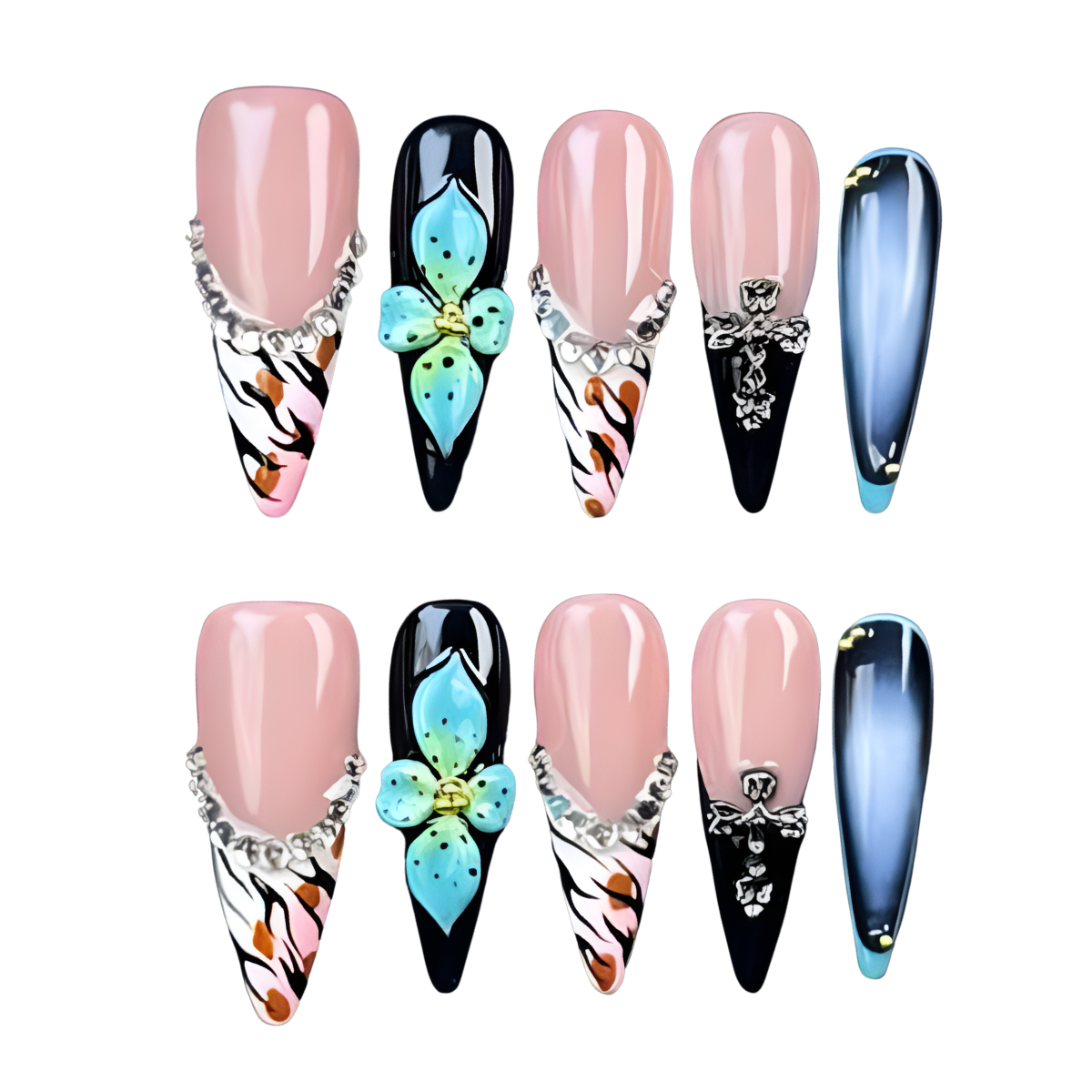 A daring blend of safari-inspired animal prints, glossy black tips, and turquoise floral accents, finished with sparkling metallic charms for a bold, exotic statement.