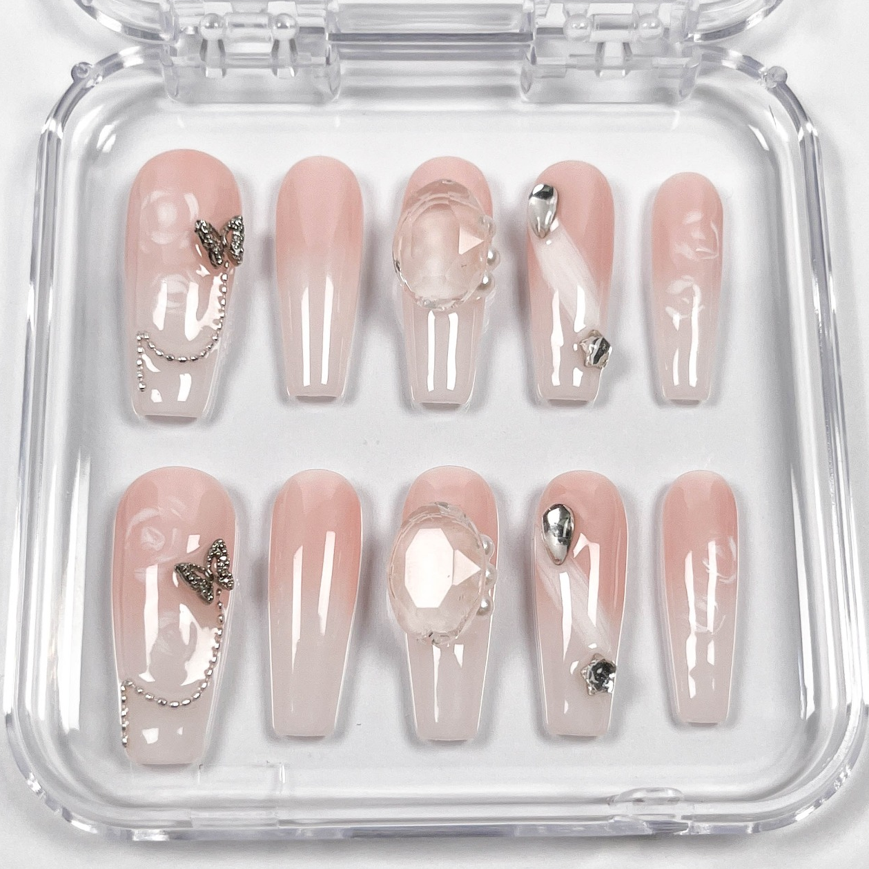 Glossy nude ombré base adorned with silver gems, delicate butterflies, and crystal-like accents for a refined sparkling look.