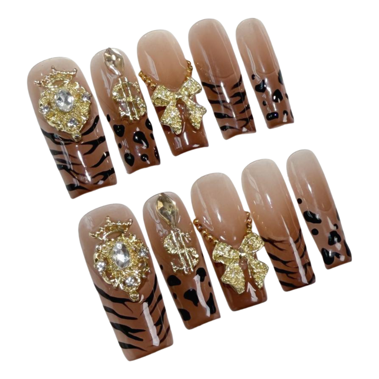 Bold animal-print nails fused with golden bows and jeweled accents, channeling fierce elegance and untamed luxury.