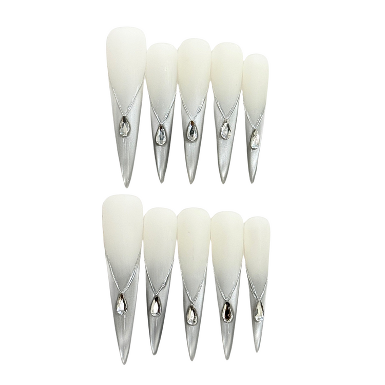 Elegant stiletto nails with a frosted white base and silver chrome V-tips, topped with teardrop crystals. Handmade, reusable, and made to shine.