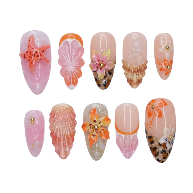 A playful fusion of starfish, seashells, and tropical blooms – capturing the wild beauty of an ocean reef kissed by sunset hues.