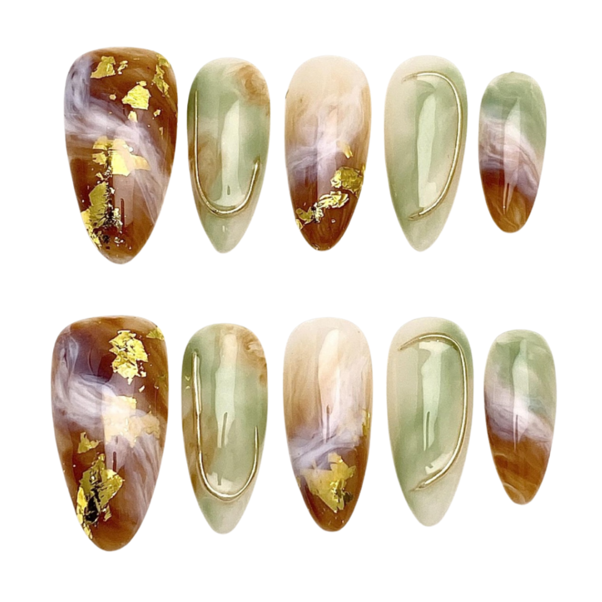 Warm brown and sage tones blended with golden foil and smoky swirls - capturing the essence of autumn leaves in motion.