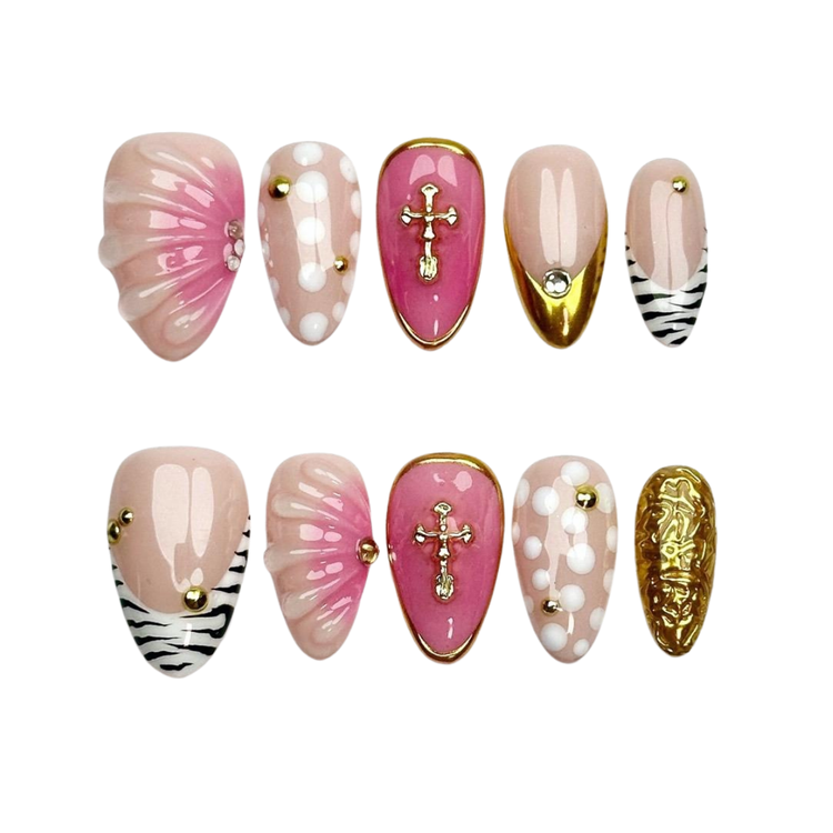 A bold mix of pinks, gold accents, zebra stripes, and polka dots, featuring crosses and sculpted metallic details for a daring, statement look.