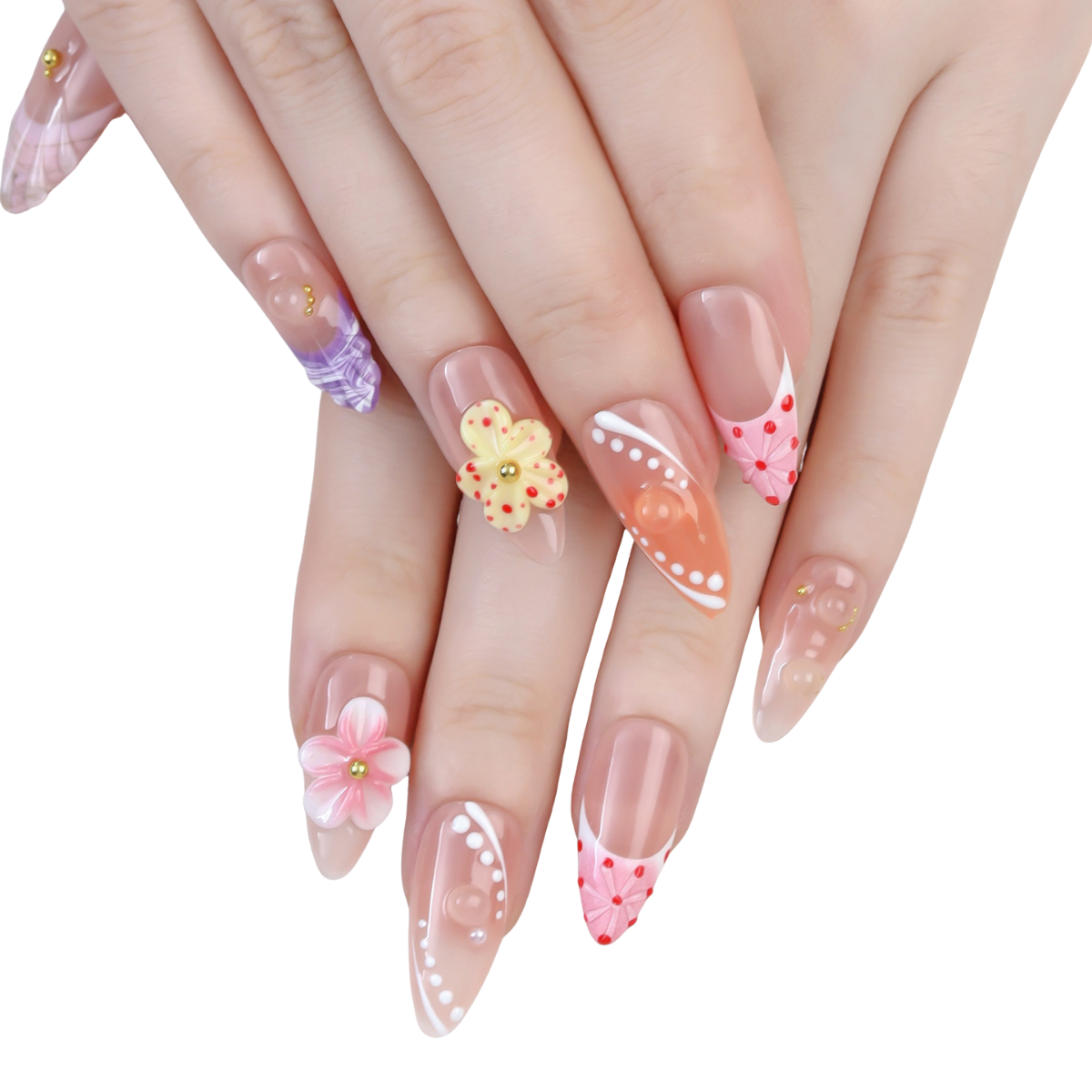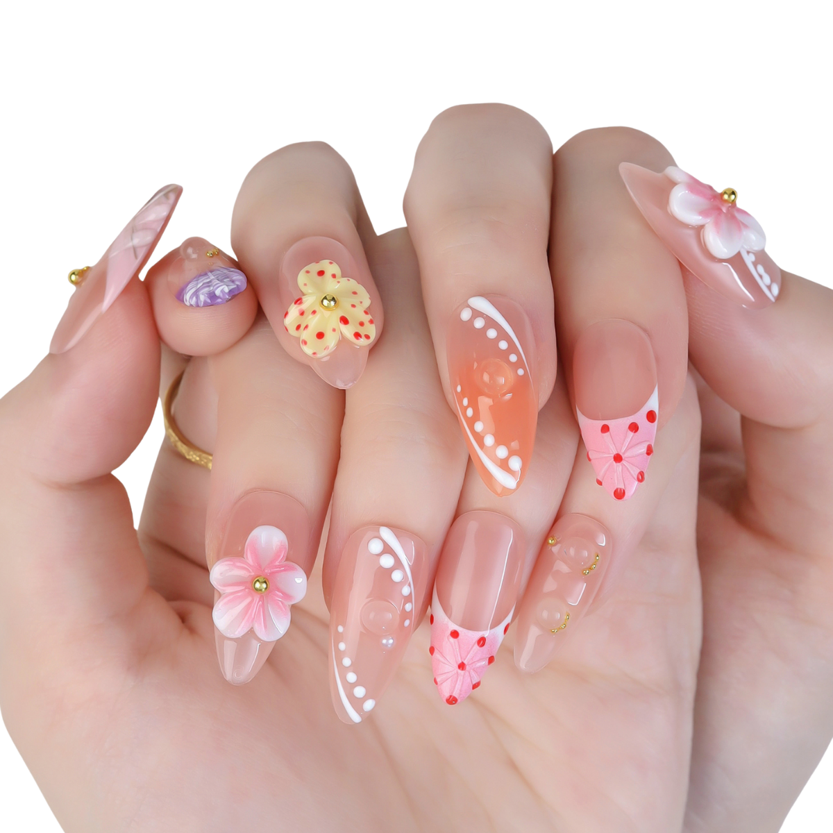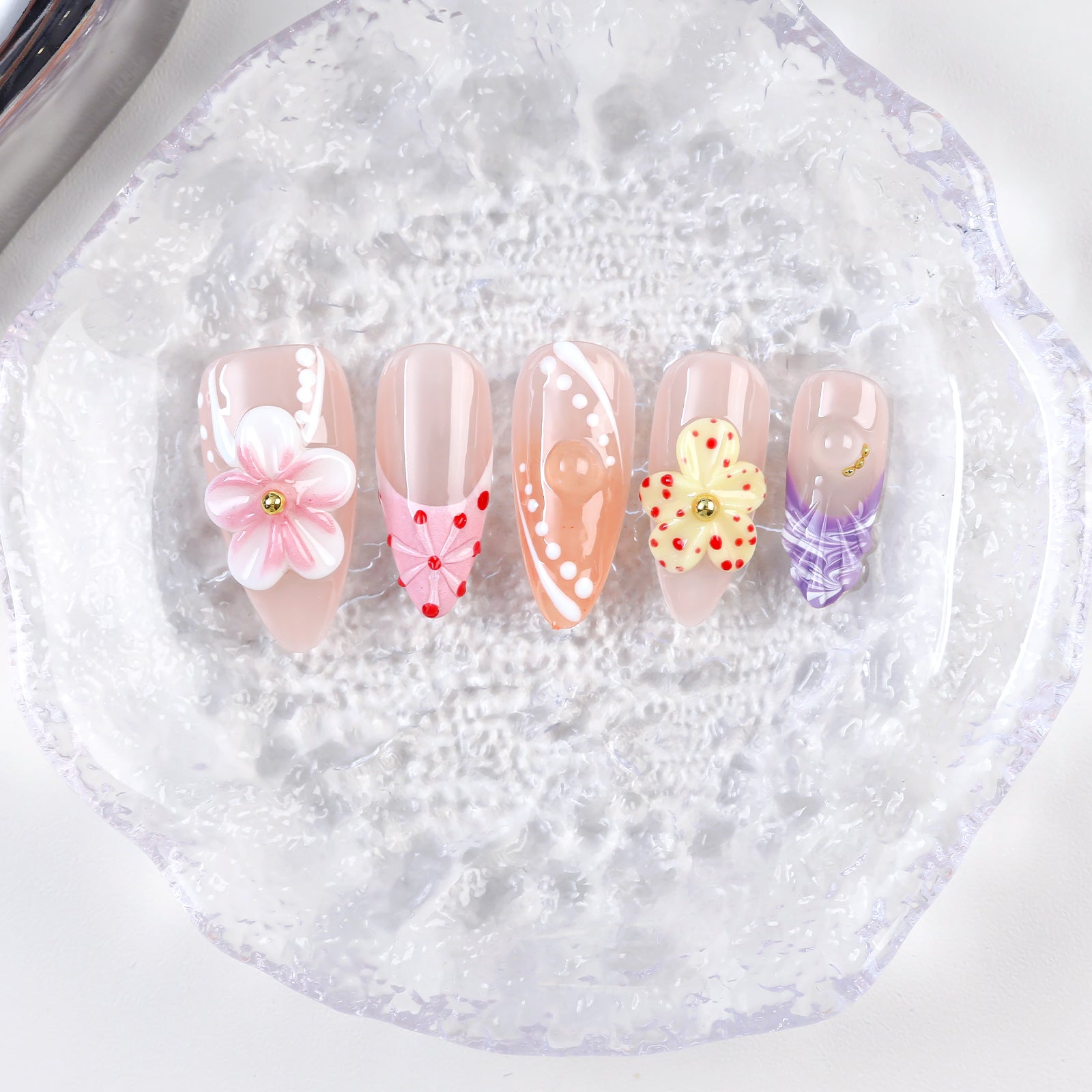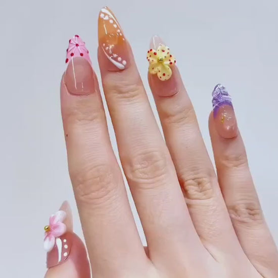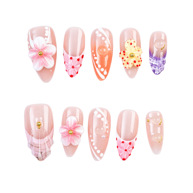 Soft peach and pink tones bloom with delicate 3D flowers and dotted details - a romantic ode to springtime beauty and feminine grace.