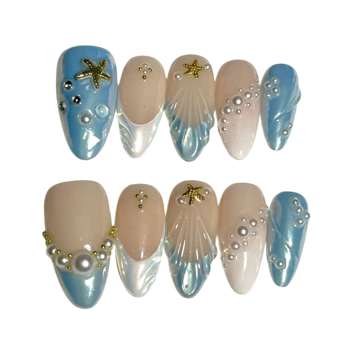 A bold yet elegant ocean-inspired design, blending soft nude tones with shimmering blue waves, adorned with pearls and golden starfish for a luxurious maritime touch.
