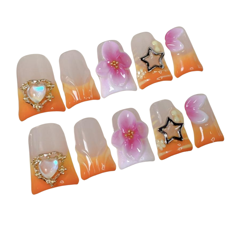 Short square nails with a radiant orange-pink ombré, adorned with 3D orchids, iridescent hearts, and playful black stars. A tropical sunset fantasy in every fingertip