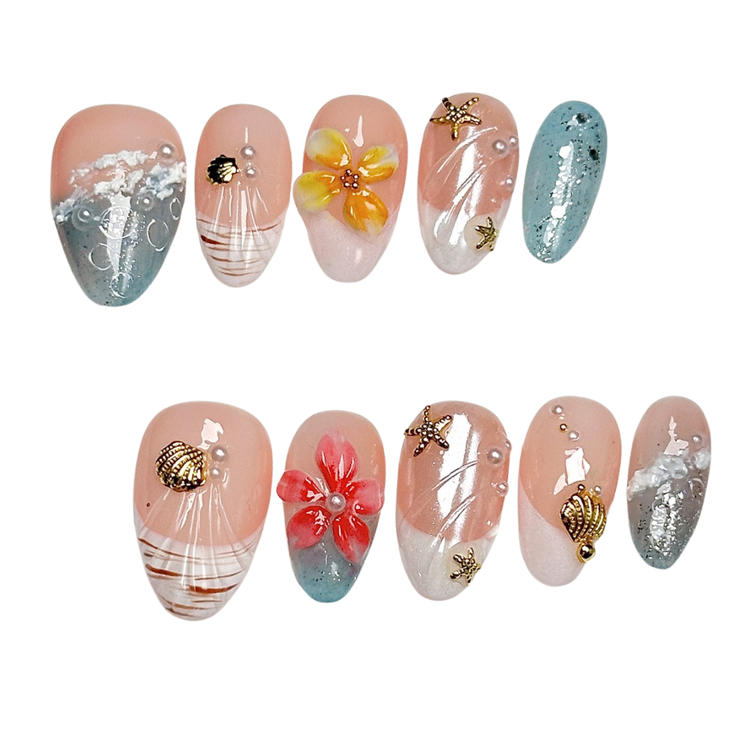 Nude base nails adorned with 3D flowers, seashells, pearls, and shimmering ocean textures - a fresh blend of floral elegance and seaside charm.