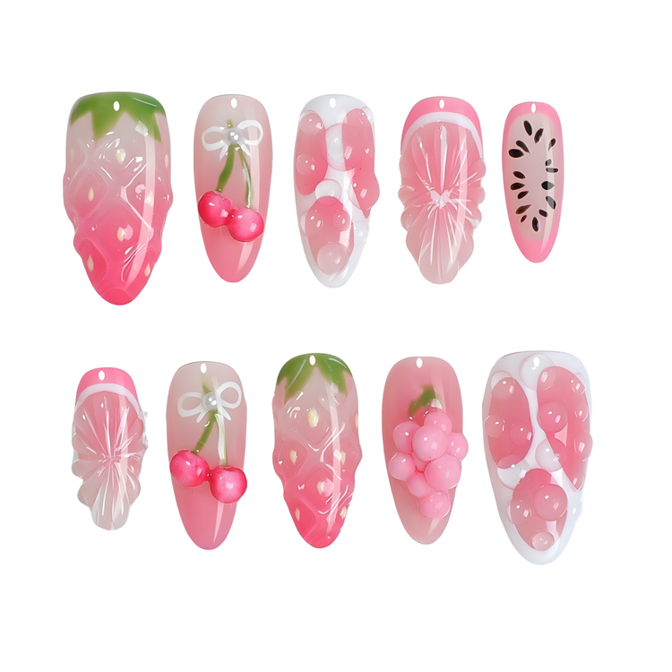 A playful mix of juicy fruit designs – strawberries, cherries, grapes, and watermelon – with a glossy, fun, and fresh vibe.