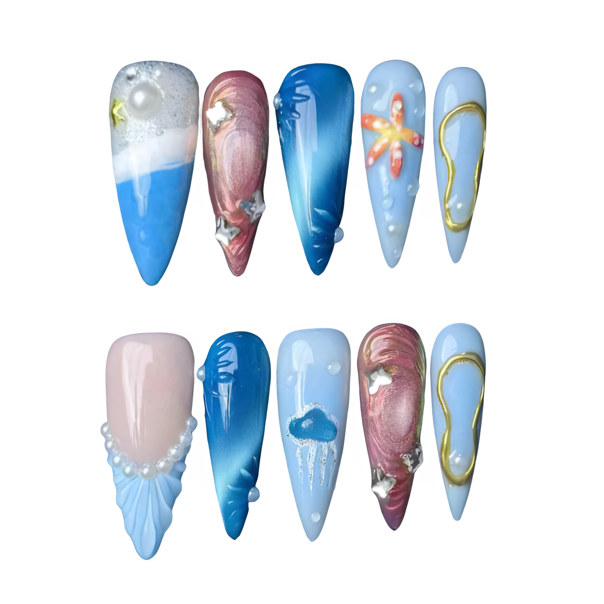 Ocean-inspired nails with seashell, starfish, and wave details, accented by pearls and shimmering metallics for a true beachy escape.