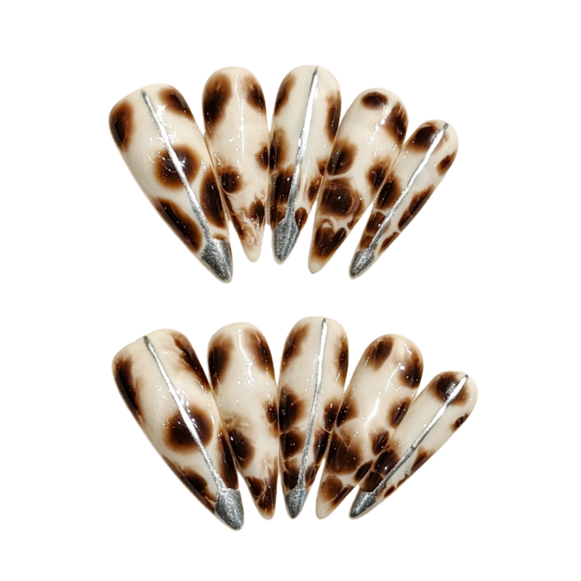 An ivory base layered with wild, organic patterns in rich brown tones, finished with sharp metallic tips. Raw, instinctive, and unapologetically bold.