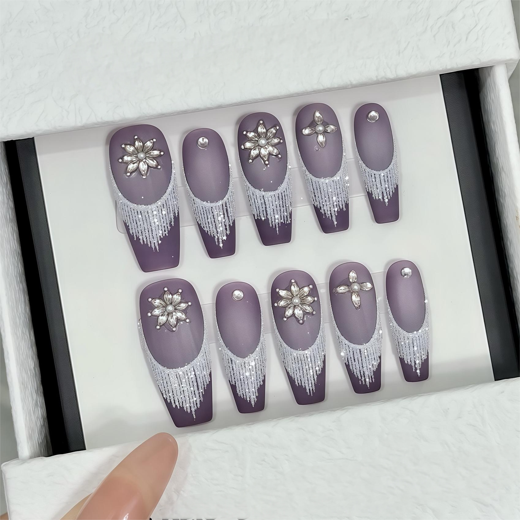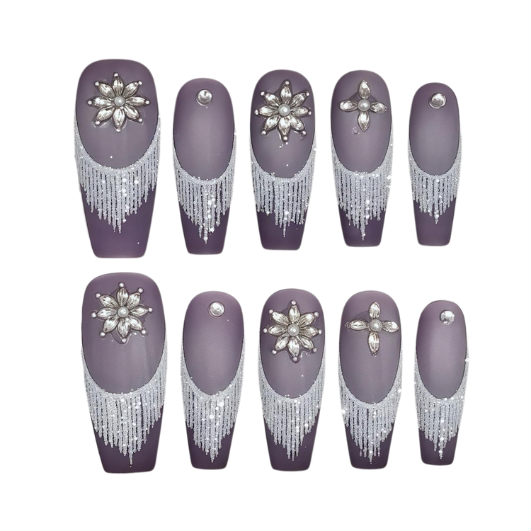 Rich plum matte base with elegant white fringe and radiant gemstone accents. Regal, bold, and red carpet–ready.