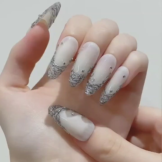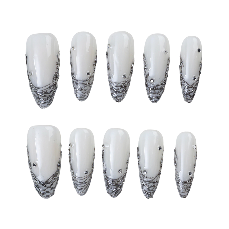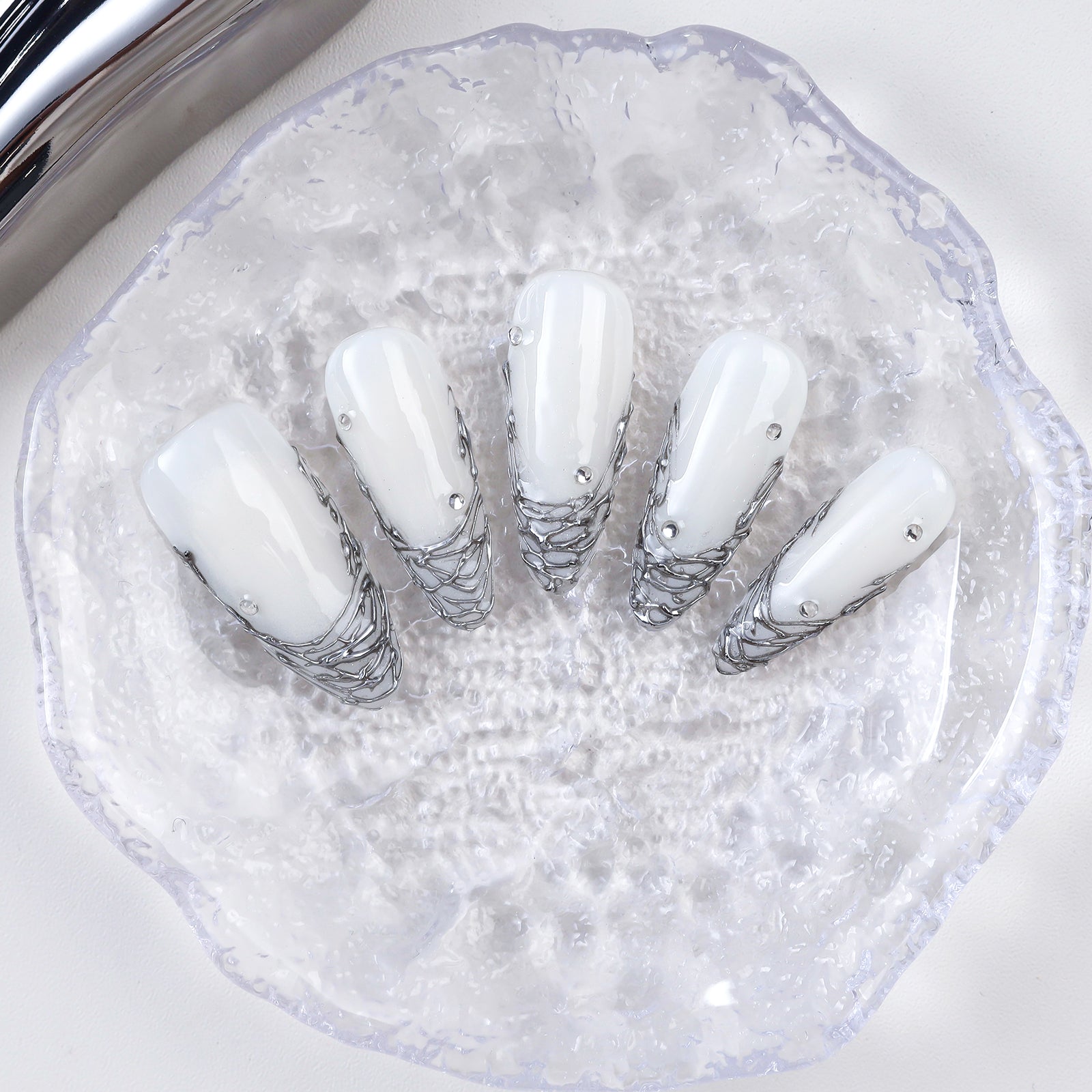 An icy white base entwined with sleek metallic lines, capturing the elegance of a spider’s web in moonlight.
