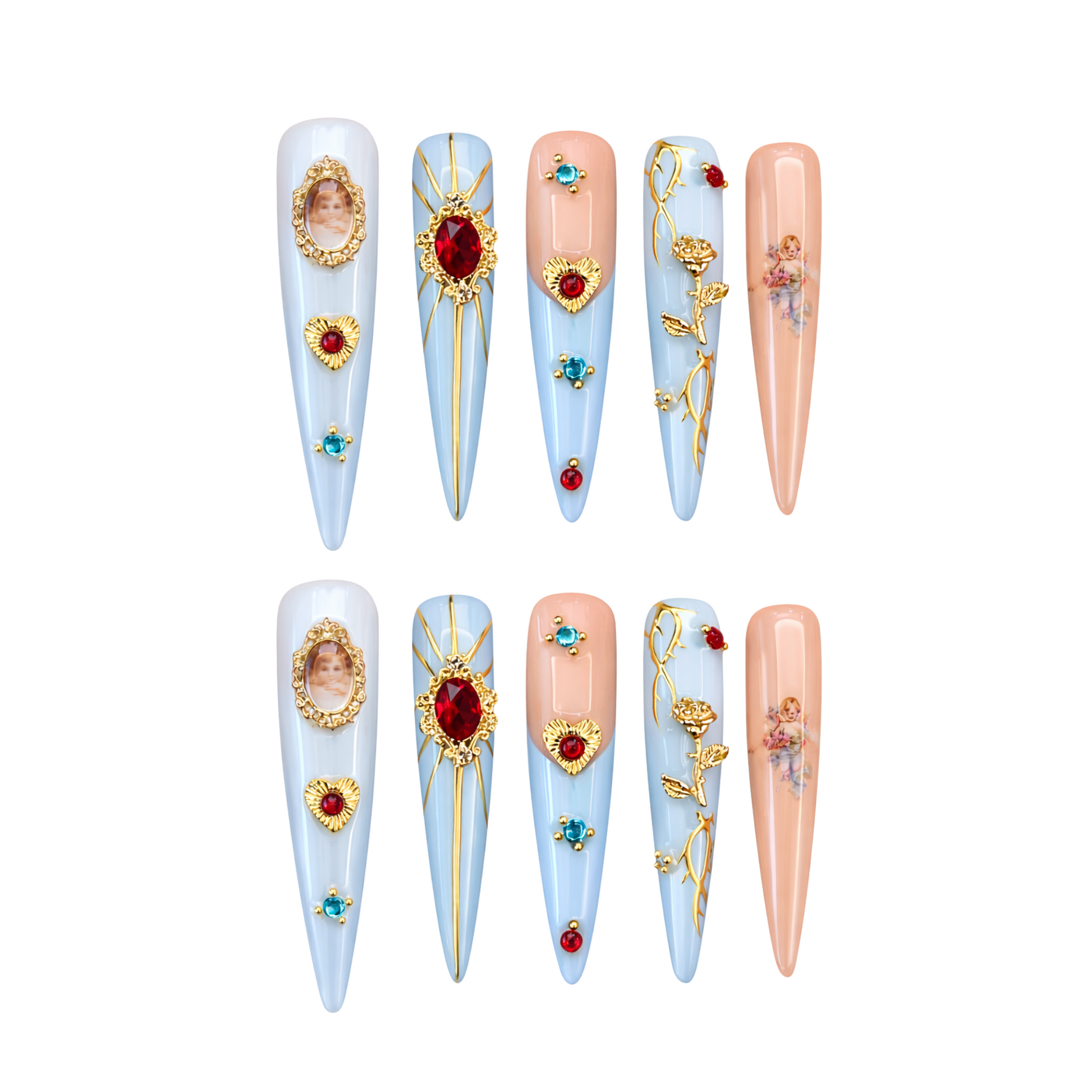 Soft pastel bases meet sculpted gold details, sacred hearts, and jewel accents, creating a look that feels timeless yet powerful.