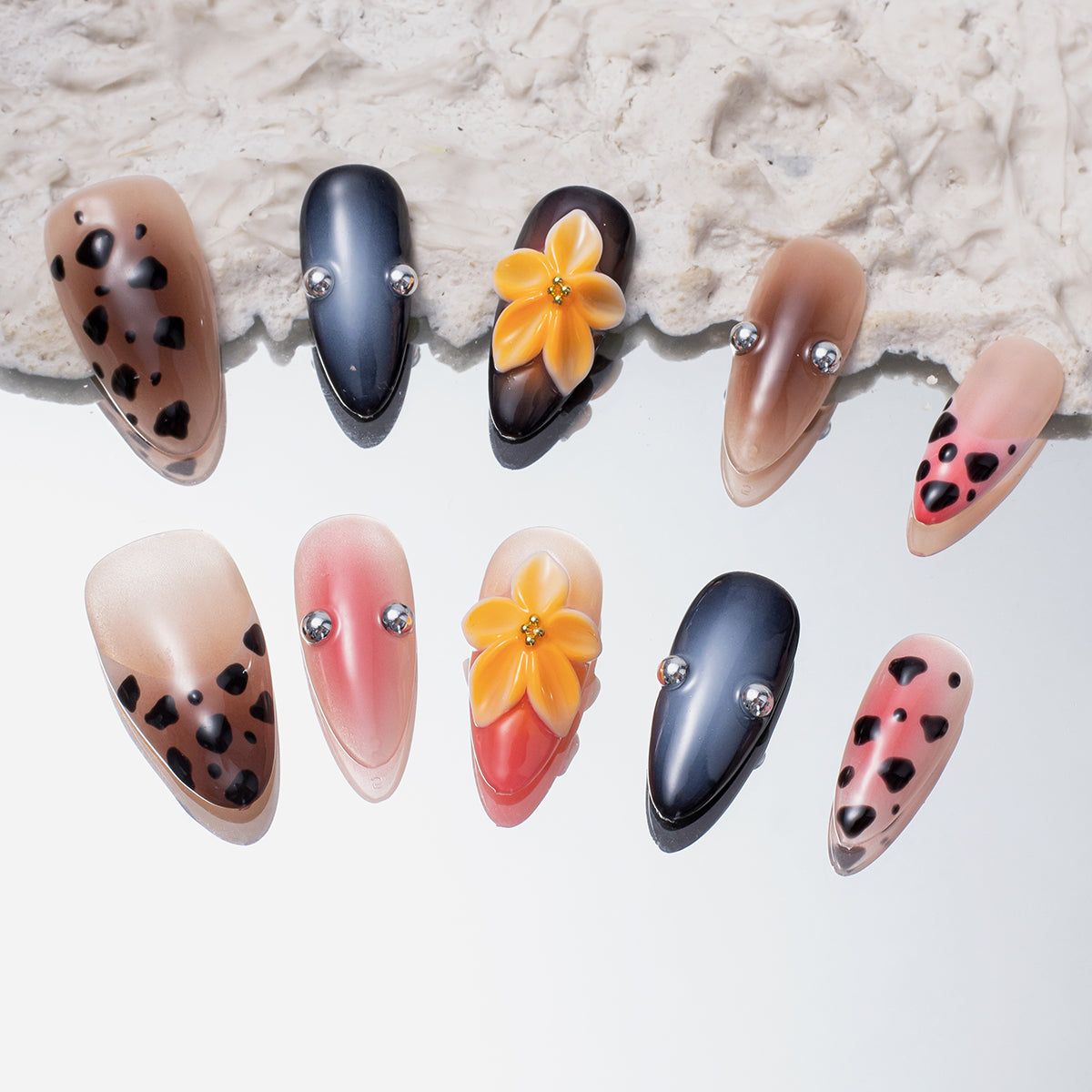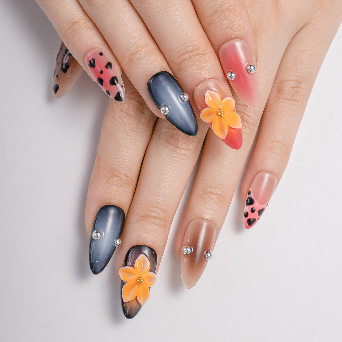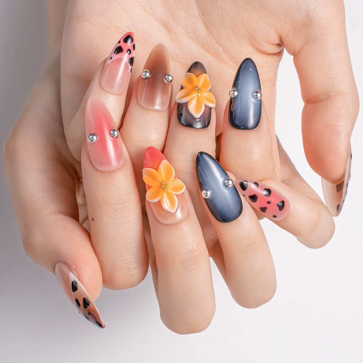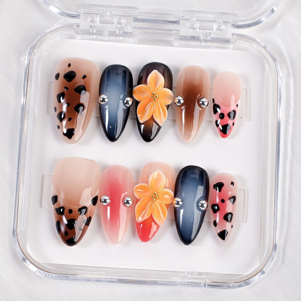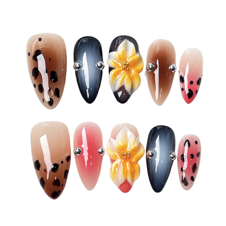 A fierce blend of safari chic and floral glam - featuring leopard spots, ombré tones, golden 3D flowers, and silver studs.