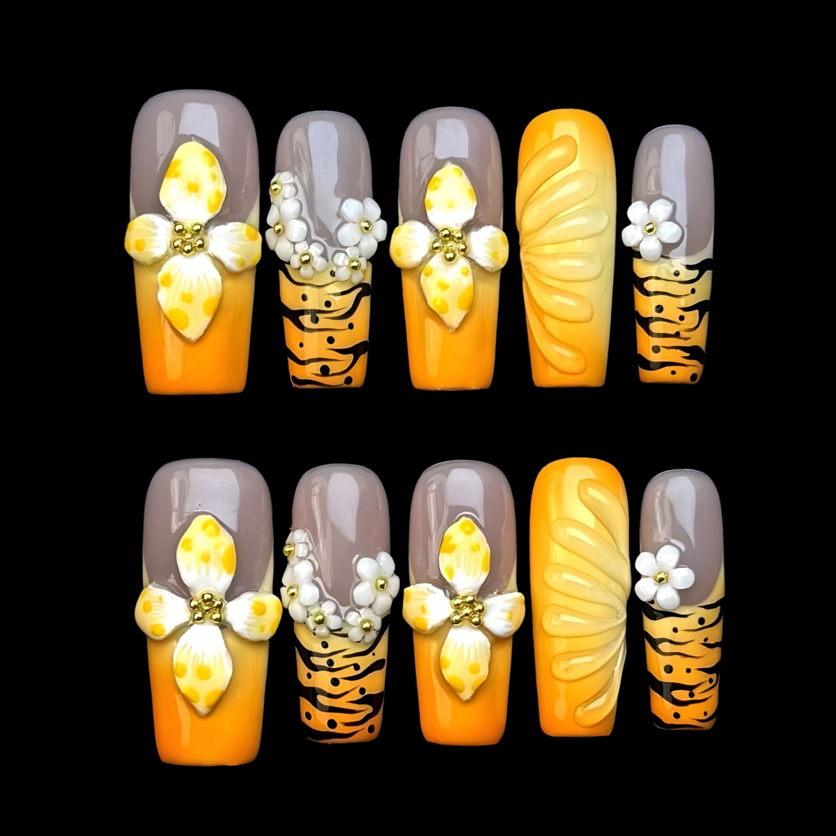 A bold fusion of golden yellow and earthy brown with tiger stripes, citrus-inspired swirls, and delicate floral accents – capturing the fiery warmth of the savanna at sunset.