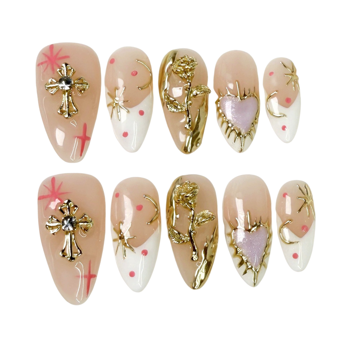 A nude-clear base with soft white accents, adorned with golden moons, crosses, roses, and lilac pearl hearts.